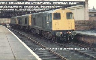 Above. 20117+20095+27014 at Dumfries 08/12/1984 it was very uncommon for locos to be stabled at Dumfries these were probably here for Sunday engineering trains |
